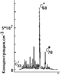 В ряде работ, указанных в обзорах [1] кластеры углерода С50 ,С60 ,С70 и др. обнаруживались в пламенах органических соединений. Сжигался бензол С6 Н6 и ацетилен С2 Н2, подаваемый в смеси с кислородом через сверх звуковое сопло диаметром 0,8мм в откачиваемую камеру с р~10-3 торр. Продукты сгорания отбирались с помощью кварцевых зондов на различных расстояниях от среза горелки и исследовались в масс-спектрометре. Распределение отрицательных и положительных кластеров по массе показано на рис.23,24.
