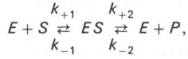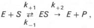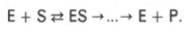 Л. Михаэлис не только постулировал образование промежуточного фермент-субстратного ES-комплекса, но и рассчитал влияние концентрации субстрата на скорость реакции. В процессе реакции различают несколько стадий: присоединение молекулы субстрата к ферменту, преобразование первичного промежуточного соединения в один или несколько последовательных (переходных) комплексов и протекающее в одну или несколько стадий отделение конечных продуктов реакции от фермента. Это можно схематически проиллюстрировать следующими примерами: