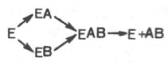 В реакциях анаболизма, например А + В —> АВ, фермент может соединяться как с одним, так и с другим субстратом или обоими субстратами: