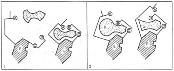 А, В, С - функциональные группы активного центра; 1 - активный комплекс; 2 - неактивный комплекс.