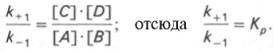 константа равновесия равна произведению концентраций образующихся веществ, деленному на произведение концентрации исходных веществ. Значение константы равновесия обычно находят из соотношения констант скоростей прямой (k+1 ) и обратной (k– 1 ) реакций, т.е. Кp = k+1 /k–1 . В состоянии равновесия скорость прямой реакции: v+1 = k + 1 [ А ] • [ B ] равна скорости обратной реакции: v–1 = k – 1 [ С ] • [ D ] , т. е. v+1 = v–1 соответственно k+1 [А]•[B] = k–1 [С]•[D], или