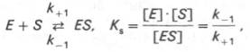 Таким образом, константа равновесия равна отношению констант скоростей прямой и обратной реакций. Величину, обратную константе равновесия, принято называть субстратной константой, или, в случае ферментативной реакции, константой диссоциации фермент–субстратного комплекса, и обозначать символом KS . Так, в реакции