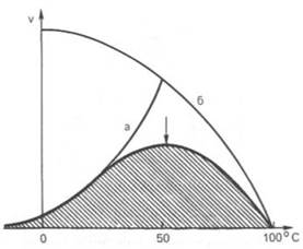 а - повышение скорости реакции как функция температуры; б - снижение скорости реакции как функция денатурации белка-фермента; стрелка указывает оптимум температуры.