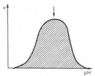 Рис. 4.17. Зависимость скорости катализируемой ферментом реакции от рН (стрелка указывает оптимум рН).