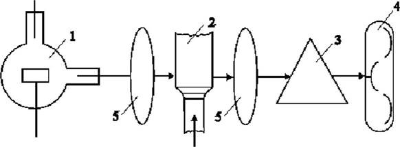 Схема спектрометра, использующего пламенный атомизатор, представлена на рис. 1. Такой спектрометр состоит из источника излучения (1), атомизатора - пламени (2), монохроматора (3) и детектора - приемника света (4), также имеется двухлинзовая оптическая система (5).