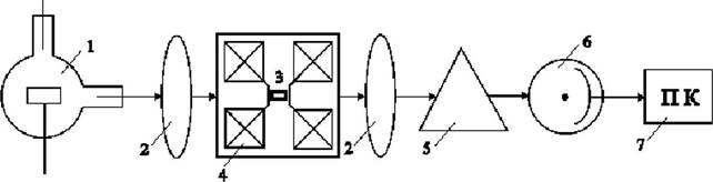 Свет от источника резонансного излучения (1) с помощью двухлинзовой оптической системы (2) пропускается через графитовую печь (3), которая расположена в воздушном зазоре электромагнита (4), питающегося однофазовым сетевым напряжением.