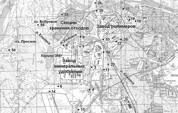 Пробы снега отбирали в марте 2011 г. на площадках с ненарушенным снеговым покровом в зоне влияния КЧХК,которые располагались по восьми румбам от источника загрязнения – завода минеральных удобрений (ЗМУ) (см. карту).