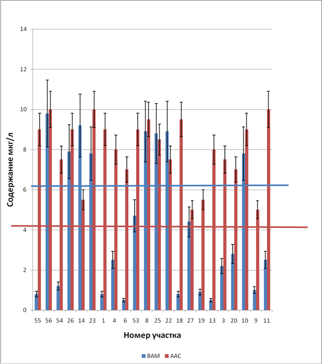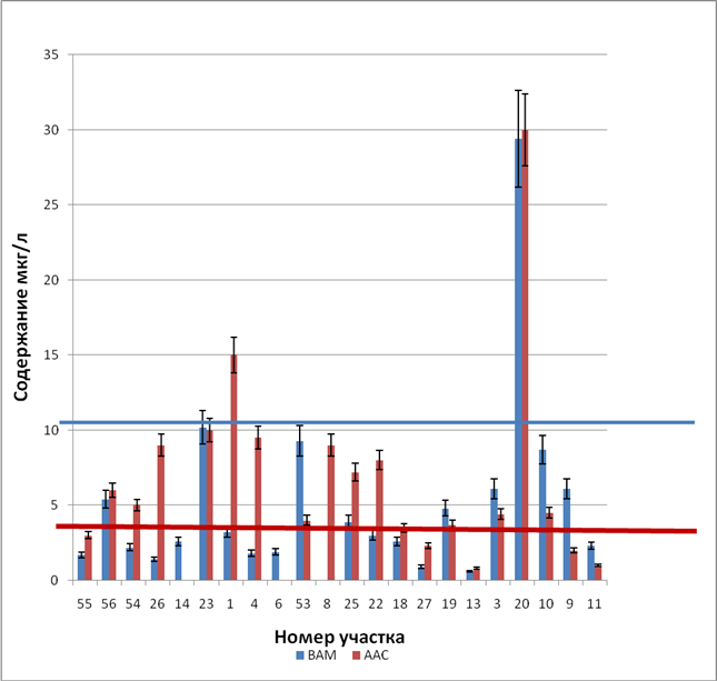 3. Различие данных, полученных методами инверсионной вольтамперометрии и атомно-абсорбционной спектрометрии, обусловлено различиями пределов обнаружения. Нижний предел обнаружения тяжелых металлов ВАМ (0,5-1 мкг/л) на порядок ниже по сравнению с ААС (5-10 мкг/л). В связи с этим для получения достоверных результатов по содержанию тяжелых металлов в снеге методом ААС, необходимо проводить предварительное концентрирование пробы.