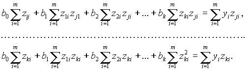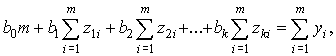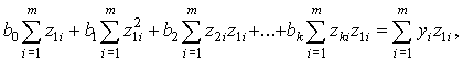 Раскрывая скобки и перенося направо слагаемые, не содержащие неизвестных коэффициентов bJ, j=0,…,k, получим систему линейных алгебраических уравнений