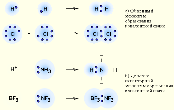 Обменный (а) и донорно-акцепторный (б) механизмы образования ковалентной связи