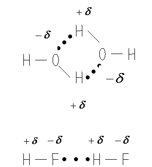 Водородная связь является особым видом химической связи. Известно, что соединения водорода с сильно электроотрицательными неметаллами, такими как F, О, N, имеют аномально высокие температуры кипения. Если в ряду Н2Тe – H2Se – H2S температура кипения закономерно уменьшается, то при переходе от H2S к Н2О наблюдается резкий скачок к увеличению этой температуры. Такая же картина наблюдается и в ряду галогенводородных кислот. Это свидетельствует о наличии специфического взаимодействия между молекулами Н2О, молекулами HF. Такое взаимодействие должно затруднять отрыв молекул друг от друга, т.е. уменьшать их летучесть, а, следовательно, повышать температуру кипения соответствующих веществ. Вследствие большой разницы в ЭО химические связи H–F, H–O, H–N сильно поляризованы. Поэтому атом водорода имеет положительный эффективный заряд (δ+), а на атомах F, O и N находится избыток электронной плотности, и они заряжены отрицательно (d-). Вследствие кулоновского притяжения происходит взаимодействие положительно заряженного атома водорода одной молекулы с электроотрицательным атомом другой молекулы. Благодаря этому молекулы притягиваются друг к другу (жирными точками обозначены водородные связи).