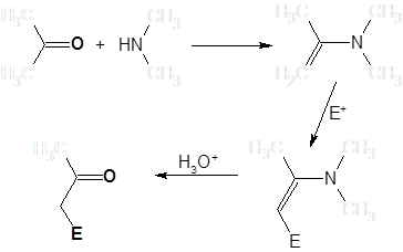 Синтезу и общим свойствам енаминов посвящена монография Дайка [1]. Как правило, енамины получаются взаимодействием карбонильных соединений с вторичными аминами (при получении с целью последующего алкилирования – обычно циклическими). В водных средах они гидролизуются, регенерируя исходные карбонильные соединения [2]: