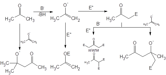 Вторая строчка таблицы несколько “лучше” – за счет наличия двух метильных групп реакция протекает более или менее однозначно. Стерические затруднения, характерные для более сложных кетонов, снижают долю полиалкилированых продуктов, хотя и увеличивают время реакции [4]. Те же пространственные факторы во многих кетонах ограничивают список потенциальных алкилирующих агентов следующими: