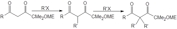 Даже с этими соединениями алкилирование кетонов через еноляты лития обеспечит высокий выход лишь для кетонов, устойчивых в сильноосновной среде (необходимой для генерирования енолятов). В случае β-дикетонов для депротонирования требуется менее основная среда. В работе [5] исследовано влияние пространственного строения бокового алкильного заместителя на скорость и региоселективность реакций алкилирования β-дикетонов: