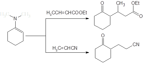 В противоположность алкилированию галогенидами, присоединение по Михаэлю активированных алкенов проходит с высокой специфичностью по атому углерода. Реакция по гетероатому в данном случае оказывается обратимой и сдвиг к термодинамически более стабильному продукту С-алкилирования приводит к хорошим выходам соответствующих алкилпроизводных: