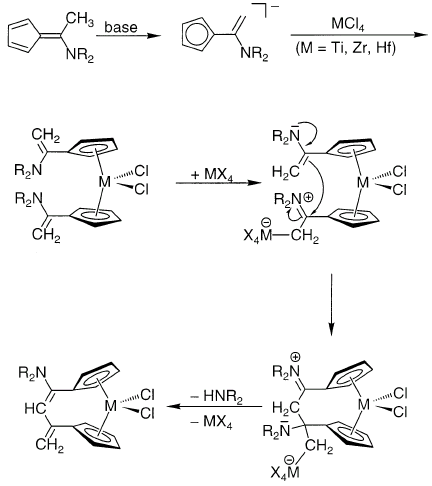 Реакции ароматических енаминов могут катализироваться тетрагалогенидами Ti, Zr, Hf [9]. В качестве любопытного примера реакции алкилирования енамина можно привести осуществленную совсем недавно межлигандную конденсацию [10]: