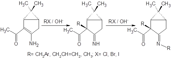 Alkylation of a bicyclic enaminoketone, 1-((1R,5R)-3-amino-6,6-dimethylbicyclo[3.1.0]hex-2-en-2-yl))ethanone, with highly reactive alkyl halides (methyl iodide, benzyl halides, and allyl halides) in a two-phase system benzene-40% aqueous NaOH in the presence of benzyltriethylammonium chloride (BTEA) as phase-transfer catalyst results in formation of stable b-diketone monoimines, derivatives of the series of 1-((1R,5R)-2-alkyl-3-imino-6,6-dimethylbicyclo[3.1.0]hex-2-yl)ethanone, in 53-81% yields.