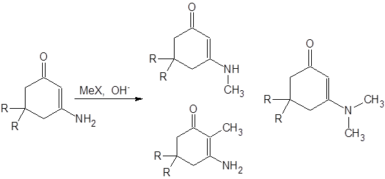В работе [13] исследовано алкилирование 3-амино-5,5-диалкилциклогекс-2-ен-1-она для различных алкильных заместителей и проведен анализ факторов, необходимых для селективного направления алкилирования по тем или иным положениям изученного енаминона: