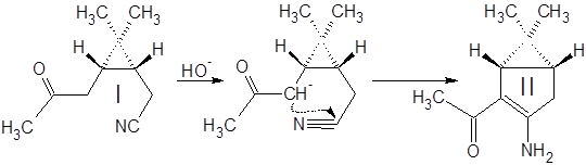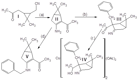 Кетонитрил I представляет собой вязкую темную жидкость, растворимую в органических растворителях и нерастворимую в воде. Реакция (а) проходит гладко и с высоким выходом (~80%) дает продукт конденсации – (3-амино-6,6-диметилбицикло[3.1.0]гекс-2-ен-2-ил)метилкетон II .