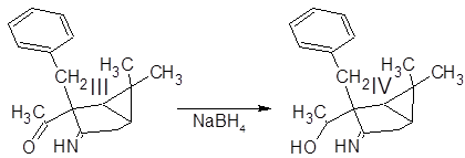 Полученный (3-амино-2-бензил-6,6-диметилбицикло[3.1.0]гекс-2-ил)метилкетон III был введен в реакцию с избытком боргидрида натрия для восстановлния карбонильной группы в спиртовую.