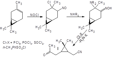Кетонитрил I (исходное соединение, чистота ~90% (ГЖХ), предоставлен ЛТС НИОХ СО РАН) является производным природного терпена – 3-карена, выделяемого из соснового скипидара:
