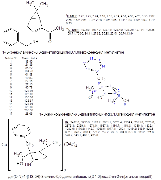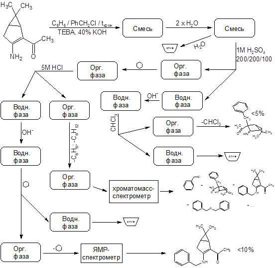 - обнаружена значительная зависимость хода реакции бензилирования (3-амино-6,6-диметилбицикло[3.1.0]гекс-2-ен-2-ил)метилкетона от температуры реакционной смеси. Установлено, что оптимальный выход С-бензилированного производного достигается при t≥35˚C.