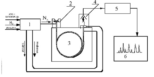 парообразное состояние; 3 – термостат колонок; 4 – детектор (в данном случае ионизационно-пламенный); 5 – усилитель; 6 – самописец
