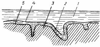 1 – подвижная фаза (газ); 2 – неподвижная жидкая фаза; 3 – твердый носитель; 4 – поверхность раздела газ-неподвижная; 5 –жидкая фаза