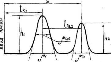 t R 1 и t R 2 – время удерживания компонентов 1 и 2; h 1 и h 2 – высоты пиков;