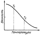 | Рис.1. Схематическая диаграмма вязкости термопластичных полимеров в зависимости от температуры: Т1 – температура перехода из стеклообразного в высоко эластичное состояние, Т2 – температура перехода из высокоэластичного в вязкотекучее состояние. | |