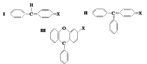 4. Арилметановые красители . Их основу составляют молекулы диарил- или триарилметана (I и II) либо фенилксантена (III). Хромофорную систему образует система сопряжённых связей с электроноакцепторными и электронодонорными заместителями (X ═ O, NH):
