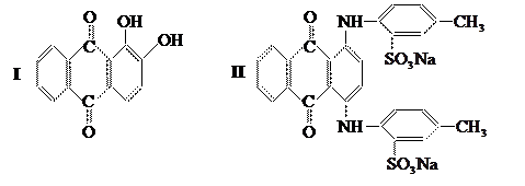 Представители этой группы – ализарин (I) и кислотный зелёный антрахиноновый (II):
