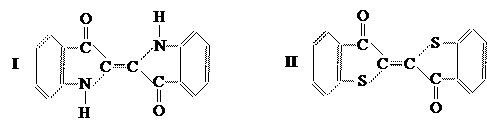 9. Индигоидные красители. В основе строения этих красителей лежит структура молекулы индиго (I) или тиоиндиго (II):