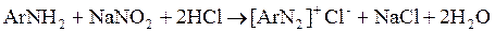2. Проводим реакцию диазотирования. Раствор охлаждаем до 0˚С и при перемешивании к нему добавляем охлаждённый водный раствор нитрита натрия. Для диазотирования применяется азотистая кислота, выделяющаяся из нитрита натрия под действием соляной кислоты. Для проведения реакции необходима низкая температура (не выше 2˚С), т.к. большинство диазосоединений неустойчивы. В процессе диазотирования раствор должен иметь кислую реакцию. Как правило, минеральной кислоты берётся в некотором избытке – 2,5 эквивалента на 1 эквивалент амина, т.к. при более высоких значениях pH равновесие ион аммония ↔ амин смещается в сторону свободного основания. Следует отметить также, что анионы галогенводородных кислот действуют в данной реакции каталитически. При небольших концентрациях водородных ионов образовавшееся диазосоединение может реагировать с исходным анилином, образуя диазоаминосоединение: ![]()