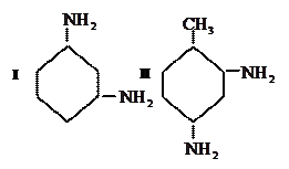 Некоторые амины бензольного ряда, например крезидин, сразу образуют азосоединения. Аминосоединения, имеющие в м -положении к аминогруппе заместитель первого рода, например м- толуидин или м- фенилдиамин, являются активными азосоставляющими, легко вступающими в реакцию сочетания. В молекулу м- фенилендиамина (I) могут вступить две азогруппы: первая вступает в положение 4, вторая – в положение 2 или 6; при этом образуется смесь двух диазокрасителей. В м -толуилендиамине (II) первая азогруппа вступает в положение 5, вторая - в положение 3: