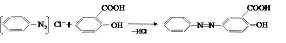 Труднее, чем фенол, вступает в реакцию сочетания салициловая кислота. Сочетание с салициловой кислотой ведут в щелочной среде; диазогруппа вступает в параположение к оксигруппе: