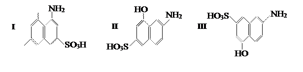 При сочетании диазосоединений с нафтолсульфокислотами диазогруппа вступает главным образом в положение, соседнее с гидроксильной группой. Азосоставляющую растворяют в содовом или щелочном растворе. Особое место среди азосоставляющих занимают аминонафтолсульфокислоты, в частности Аш-кислота (I), гамма-кислота (II) и И-кислота (III):