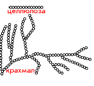 В отличие от амилозы, амилопектин не растворим в воде и имеет разветвленное строение. В его молекуле остатки α-глюкозы связаны не только 1,4-связями, но и 1,6-связями: