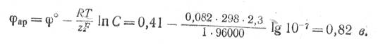 Нормальный электродный потенциал разряда ОН- -ионов составляет + 0,41 в, а нормальный электродный потенциал разряда ионов хлора равен + 1,36 в. В нейтральном насыщенном растворе хлористого натрия концентрация гидроксильных ионов около 1 ·10- 7 г-экв/л. При 25° С равновесный потенциал разряда гидроксильных ионов будет
