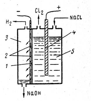 Раствор хлорида натрия подается в анодное пространство, фильтруется сквозь диафрагму и достигает катода. Скорость фильтрации электролита характеризуется так называемой протекаемостью диафрагмы v