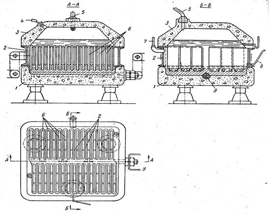 1— бетонное днище; 2 — стальной катод; 3 — бетонная крышка; 4 — труба для подачи рассола; 5 — труба для отвода хлора; 6 — графитовые аноды; 7 — штуцер для удаления водорода; 8 — трубка для слива электролитического щелока; 9 — медный токоведущий