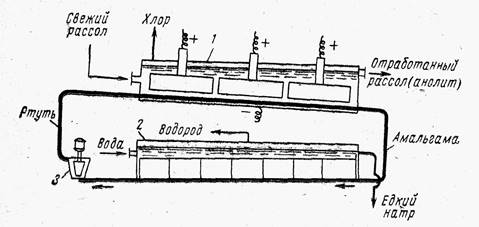 К слегка наклонному дну ванны подведена катодная шина и по нему непрерывно движется тонкий слой ртути. Таким образом, днище ванны является катодом. Электролизер питается концентрированным (310—315 г/л) раствором хлорида натрия, который в процессе электролиза обедняется поваренной солью до концентрации 260—270 г/л, выводится из ванны, обесхлоривается под разряжением и при продувке его сжатым воздухом, донасыщается солью, очищается от примесей (в схеме не показано) и передается обратно на электролиз. Образующийся хлор выводится через крышку ванны.