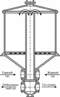 В нижней части адсорбера находятся нижняя и верхняя головки с восемью штуцерами для ввода и вывода газов и паров на разных стадиях процесса. Внутри адсорбера расположена труба, отводящая газ во время охлаждения, сушки и насыщения. При десорбции водяной пар подают по трубе в верхнюю часть адсорбера. Такая конструкция позволяет все управление адсорбером сосредоточить внизу.