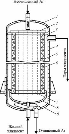 Примером эффективного использования адсорберов с вертикальными теплообменными элементами является очистка аргона, гелия, неона от примесей кислорода и азота, осуществляемая при низкой температуре