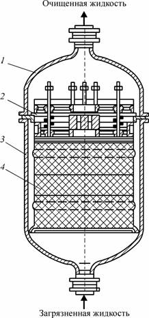 На рис. 6. представлен фланцевый адсорбер, используемый для очистки сжиженного воздуха от ацетилена мелкопористым силикагелем в условиях низких температур. Среднее содержание ацетилена в жидкости перед очисткой составляет 0,2 10–3 м3/м3. десорбцию ацетилена осуществляют при температуре около 0 С и давлении 0,15 МПа продувкой слоя адсорбента газом сначала при 20–25, а затем при 50–75 С.