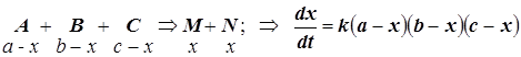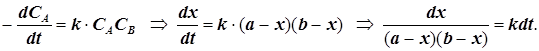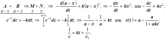 - если начальные концентрации с обоих реагентов равны a, то до самого окончания реакции равными останутся и их текущие концентрации a- x (у продуктов x), и получаем: