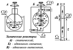 Устройства, предназначенные для кинетических измерений, называют химическими реакторами. Реактором может служить любой сосуд или его фрагмент, в том числе и такой, которому приданы какие-либо специальные геометрические формы. Различают реакторы статические и проточные. В свою очередь идеальные проточные бывают идеального смешения и идеального вытеснения. Концентрации веществ в реакторе во времени могут изменяться за счёт: а) химического превращения, б) массопереноса. Химическая реакция это переход системы в термодинамически - равновесное состояние за счёт перестройки молекулярно-атомной структуры её компонентов. Неравновесное распределение концентраций в реакционном пространстве является причиной массопереноса, и возникает диффузия. В гомогенной среде с однородным распределеним концентраций в статическом реакторе градиент концентраций отсутствует, и диффузии нет, но в проточных реакторах необходимо специально предусмотреть условия для количественного разделения концентрационных изменений чисто кинетической и диффузионной природы. Примеры химических реакторов показаны на рисунке. Эффективное (а в статическом реакторе полное) устранение градиента концентрации достигается искусственно механическим перемешиванием реакционной среды.