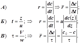 u- модуль линейной скорости потока в реакторе идеального вытеснения; w- объёмная скорость потока в реакторе идеального смешения ; V- объём реактора идеального смешения; - время контакта в реакторе идеального смешения; r - скорость химической реакции;