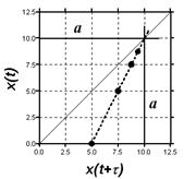 Согласно формуле (2.13) значение x¥ = c0, а согласно (2.17) эта величина лежит на биссектрисе угла между осями декартовых координат (если их масштабы равны) на пересечении с графиком функции (2.16). Так получается один из способов экстраполяционного определения начального содержания реагента. Это особенно важно в тех случаях, когда по каким-то причинам измерить точно эту величину затруднительно. Для этой цели кинетические данные измеряют или представляют через равные интервалы времени. Вся процедура определения x¥ = c0 = a показана ниже на модельном примере.