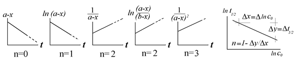 Проводят серию экспериментов, изменяя начальную концентрацию одного из реагентов. Определяют время убыли его концентрации вдвое, и обрабатывают данные в спрямляющих переменных согласно уравнению